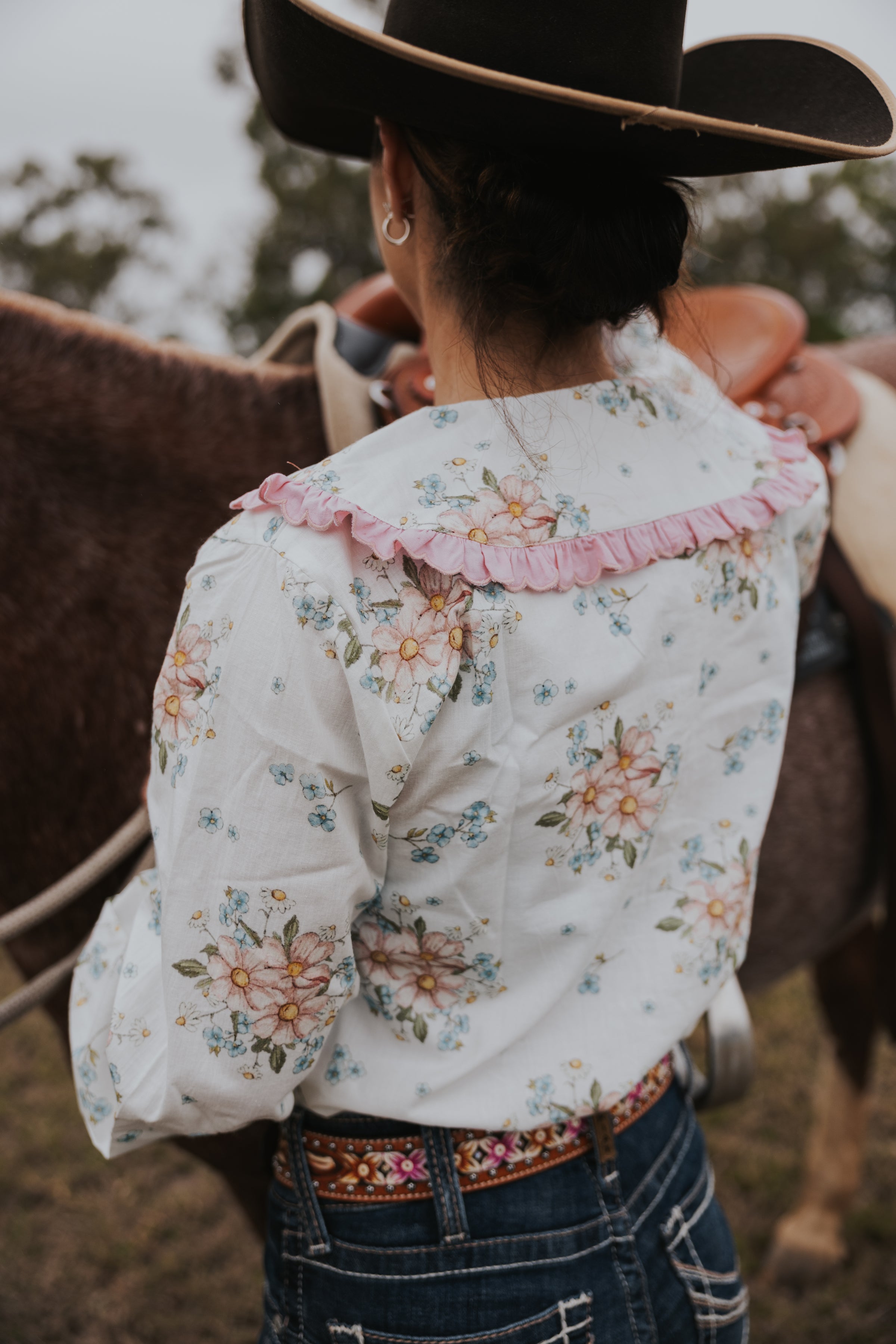Step into soft country elegance with the Ophelia Blouse — a romantic nod to vintage style. Made from 100% breathable cotton, this blouse features a hand-drawn floral print and is finished with sweet scalloped frills on the collar and cuffs in a delicate pink. Balloon sleeves and a dainty neck tie add a feminine flair, perfect for dressing up or down. Whether you’re saddle-side or strolling through town, this blouse brings charm, comfort, and classic Western soul to any outfit.